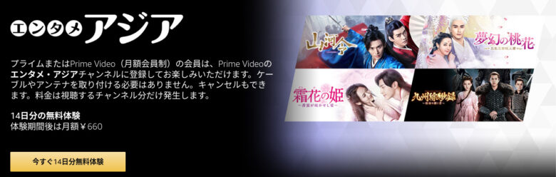 すでにプライム会員の方でそのチャンネルを初めて利用する場合「無料体験を開始する」ですぐに始められます。