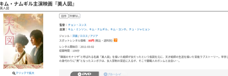| ②美人図 キム・ナムギル | 愛し合う男女の美しいラブシーンは、尺も長く大満足 若くて初々しい青年役のナムギルさんを堪能できます 詳しいレビューを見る » |