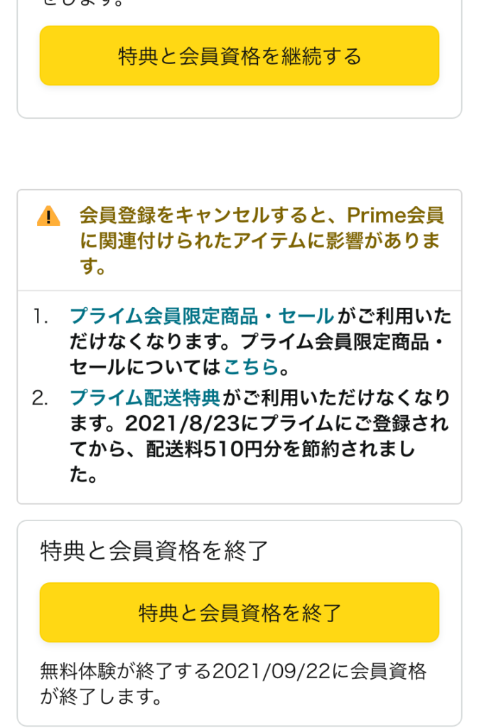 ・継続するかもしれないと言う方は、3日前にメールでお知らせを選択しますが、30日間のみと決めている方は「終了する」を選択します。(終了を選択しても、30日間はそのまま特典を利用できます)